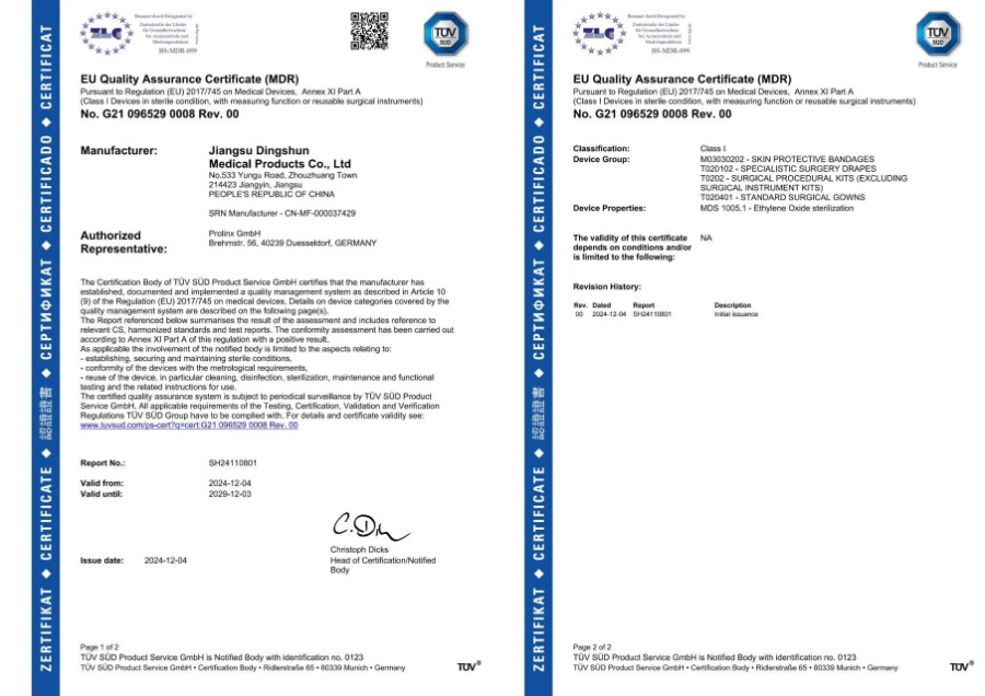Dingshun Medical artık CE, MDR, FDA, ISO13485 ve ISO9001 dahil olmak üzere birçok uluslararası sertifikayı geçti.